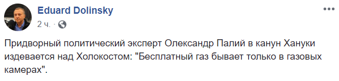 "Придворный политический эксперт Олександр Палий в канун Хануки издевается над Холокостом: "Бесплатный газ бывает только в газовых камерах"", - пишет в Facebook глава украинского Еврейского конгресса Эдуард Долинский.