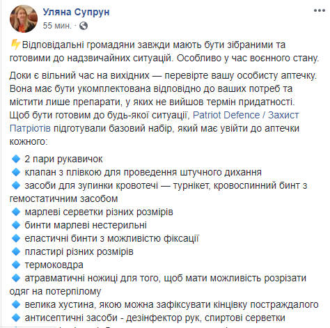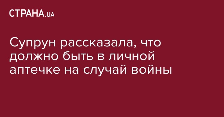 И. о. министра здравоохранения Украины Ульяна Супрун рассказала, что должно находиться в личной аптечке для чрезвычайной ситуации. Об этом чиновник сообщила в Facebook.