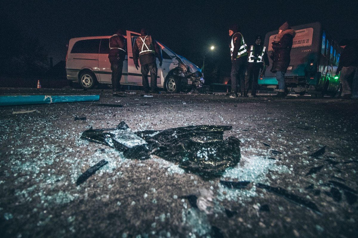Установлено, что микроавтобус Mercedes на высокой скорости двигался по крайней левой полосе в сторону Борисполя, он пытался перестроиться и задел боковое зеркало автомобиля Mitsubishi Pajero. После чего микроавтобус стало сносить с дороги и он въехал в бок Hyundai. В результате чего ударило сзади маршрутку TATA.