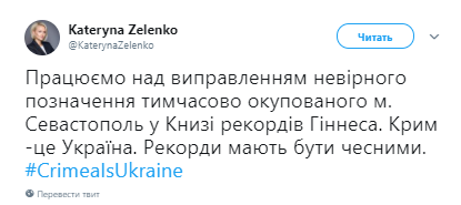 "Работаем над исправлением неправильного обозначения временно оккупированного г. Севастополя в Книге рекордов Гиннеса. Крым - это Украина. Рекорды должны быть честными", - написала она в соцсети.