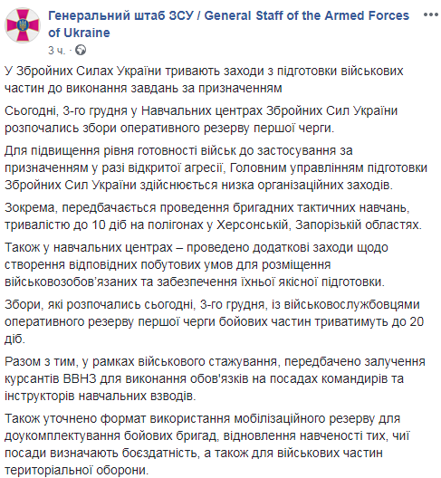 В понедельник, 3 декабря, в учебных центрах ВСУ начались сборы оперативного резерва первой очереди. Пришедших на них повезут на учения для "повышения боеготовности в случае нападения".