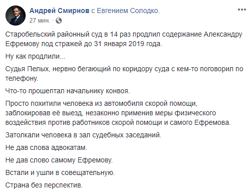 "Старобельский районный суд в 14 раз продлил содержание Александру Ефремову под стражей до 31 января 2019 года. Ну как продлили... Судья Пелых, нервно бегающий по коридору суда с кем-то поговорил по телефону. Что-то прошептал начальнику конвоя. Просто похитили человека из автомобиля скорой помощи, заблокировав её выезд, незаконно применив меры физического воздействия против работников скорой помощи и самого Ефремова. Затолкали человека в зал судебных заседаний. Не дав слова адвокатам. Не дав слово самому Ефремову. Встали и ушли в совещательную. Страна без перспектив", - написал адвокат.