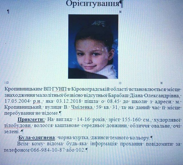 Всех, кому известна какая-либо информация о местонахождении Дианы, просят позвонить по телефону 066-984-10-87 или "102".