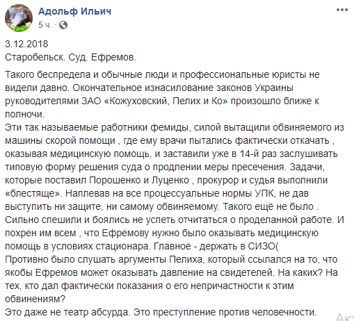 "Хочу поздравить адвокатскую группу Ефремова с удачным заседанием вчерашнего суда в Старобельске, где клиенту в 14 раз продлили меру пресечения. Итого под утро. Побитый и замучанный клиент, перепуганная скорая помощь, безукоризненно хамский судебный процесс и две дороги, проложенные ночным процессом - одна красная для председательствующего Пелиха в Молдову или т.н. "ДНР", и вторая для адвокатов - в ЕСПЧ.