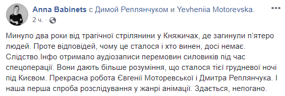 Видео анимации появилось на канале YouTube 3 декабря. "Прошло два года с трагической стрельбы в Княжичах, где погибли пять человек. Однако ответов, почему это произошло и кто виноват, пока нет. Слідство.Інфо получило аудиозаписи переговоров силовиков во время спецоперации. Они дают больше понимания, что произошло той декабрьской ночью под Киевом. Прекрасная работа Евгении Моторевськой и Дмитрия Реплянчука. И наша первая попытка расследования в жанре анимации", - рассказала о проекте журналист Анна Бабинец на своей странице в Facebook.
