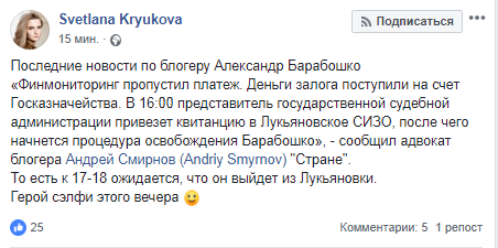 "Финмониторинг пропустил платеж. Деньги поступили на счет Госказначейства. В 16:00 представитель государственной судебной администрации привезет квитанцию в Лукьяновское сизо, после чего начнется процедура освобождения Барабошко", - сообщил адвокат блогера Андрей Смирнов.