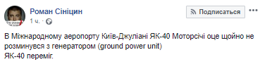 В киевском аэропорту в Жулянах сегодня произошел инцидент. Самолет авиакомпании "Мотор-Сич" столкнулся с аэродромным генератором. Об этом сообщил волонтер Роман Синицын на своей странице в Facebook.