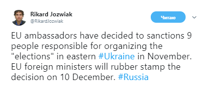 "Послы ЕС решили ввести санкции в отношении 9 человек, ответственных за организацию "выборов" на востоке Украины в ноябре. Министры иностранных дел стран ЕС утвердят решение 10 декабря", - отметил он.