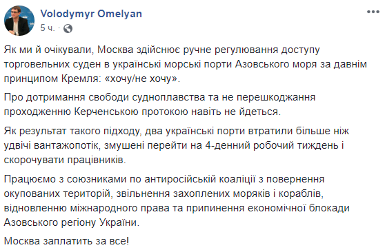 "Как мы и ожидали, Москва осуществляет ручное регулирование доступа торговых судов в украинские морские порты Азовского моря по древнему принципу Кремля: "хочу/не хочу"... В результате такого подхода, два украинских порта потеряли более чем вдвое грузопоток, вынуждены перейти на 4-дневную рабочую неделю и сокращать работников", - написал министр.