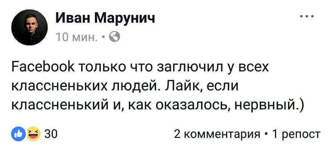 "Пользователи Facebook только что заглючил у всех классненьких людей. Лайк, если классненький и, как оказалось, нервный.)"