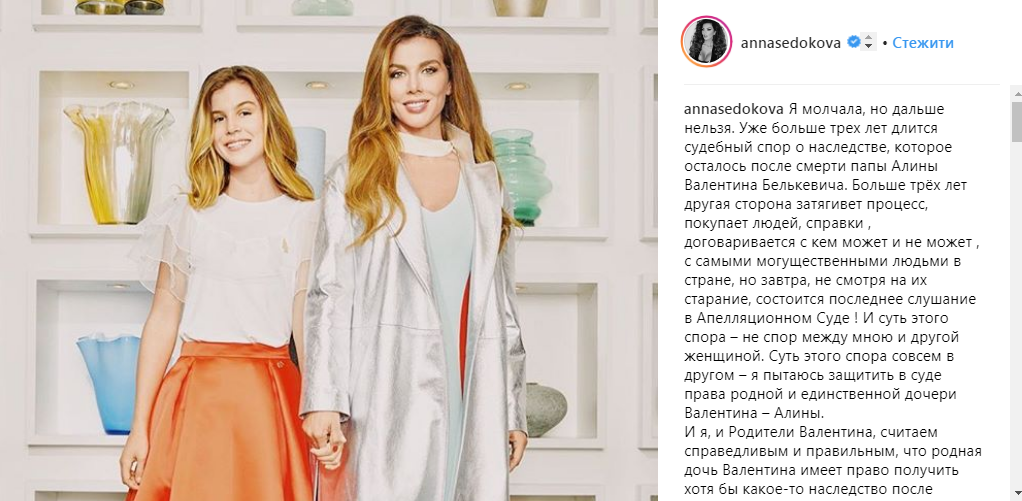 "Я молчала, но дальше нельзя. Больше трех лет другая сторона затягивает процесс, покупает людей, справки, договаривается с кем может и не может, с самыми могущественными людьми в стране, но завтра, несмотря на их старание, состоится последнее слушание в Апелляционном суде! И суть этого спора – не спор между мною и другой женщиной. Суть этого спора совсем в другом – я пытаюсь защитить в суде права родной и единственной дочери Валентина – Алины",- пишет Анна.