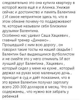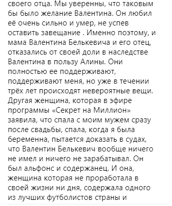 "Другая женщина, которая в эфире программы "Секрет на миллион" заявила, что спала с моим мужем сразу после свадьбы, спала, когда я была беременна, пытается доказать в судах, что Валентин Белькевич вообще ничего не имел и ничего не зарабатывал. Он был альфонс и содержанец. И она, женщина, которая не проработала в своей жизни ни дня, содержала одного из лучших футболистов страны и следовательно это она купила квартиру, в которой жила еще я и Алинка. Унижая сейчас и достоинство, и память Валентина, и самое неприятное здесь то, что в этом обмане почему-то поддерживают те, которые называли себя близкими друзьями Валентина", - делится певица.