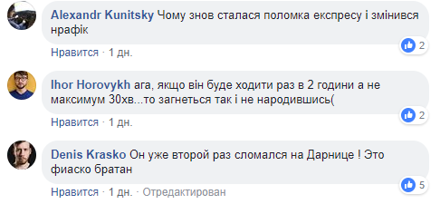 После второй поломки 4 декабря пользователи оставили возмущенные комментарии на странице руководителя "Укрзализныци", где упомянули и поломку, и изменение графика с интервалами раз в 2 часа, а не раз в 30 минут, как обещали ранее.