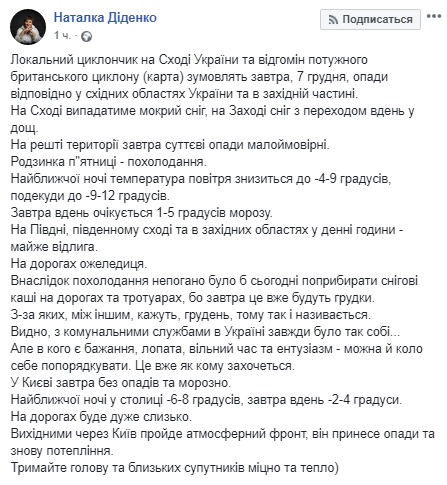 7 декабря в восточных областях Украины будет царить локальный циклон, также страну затронут отголоски мощного британского циклона. Об этом сообщила синоптик Наталья Диденко у себя на странице в Facebook.