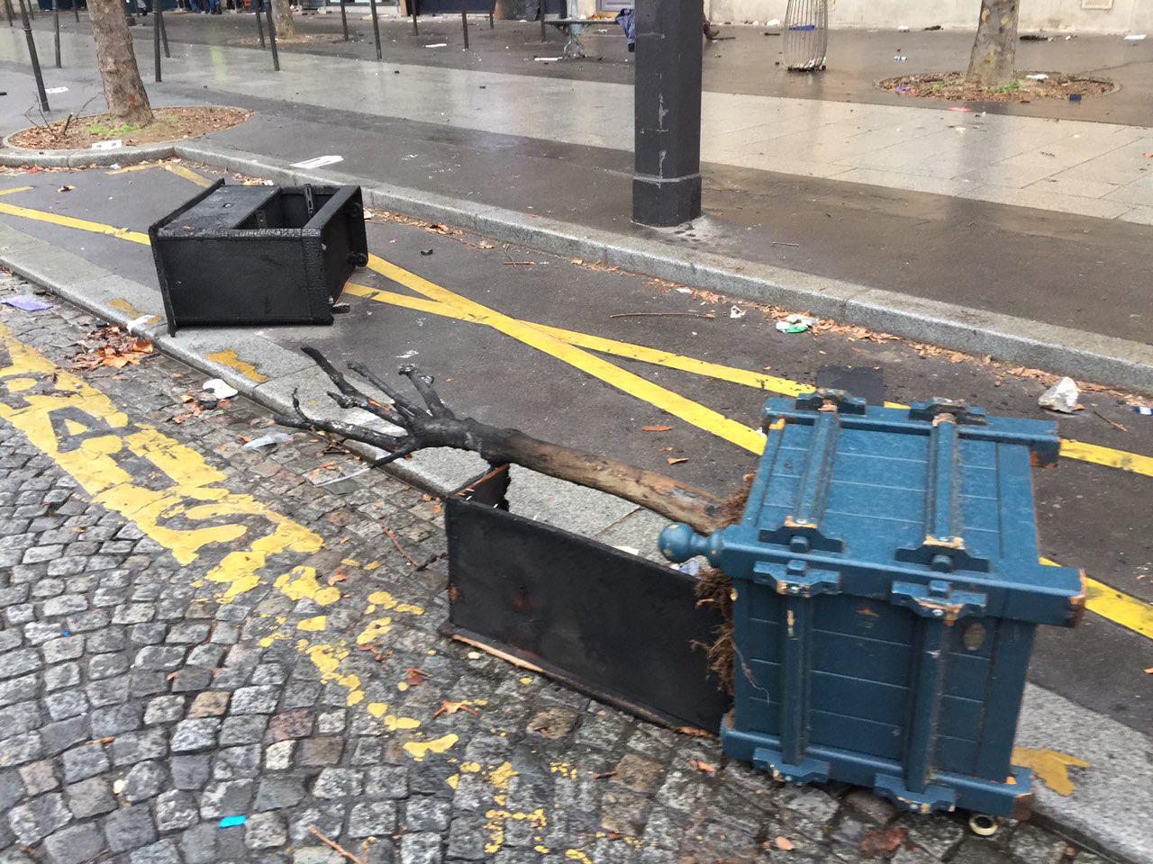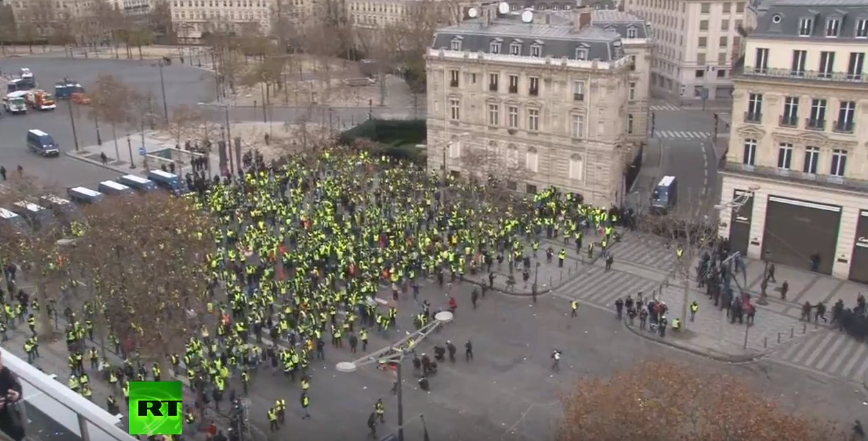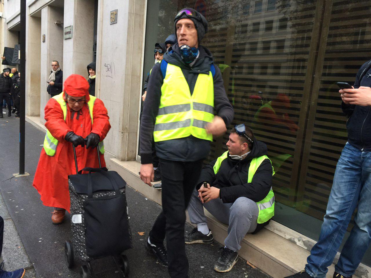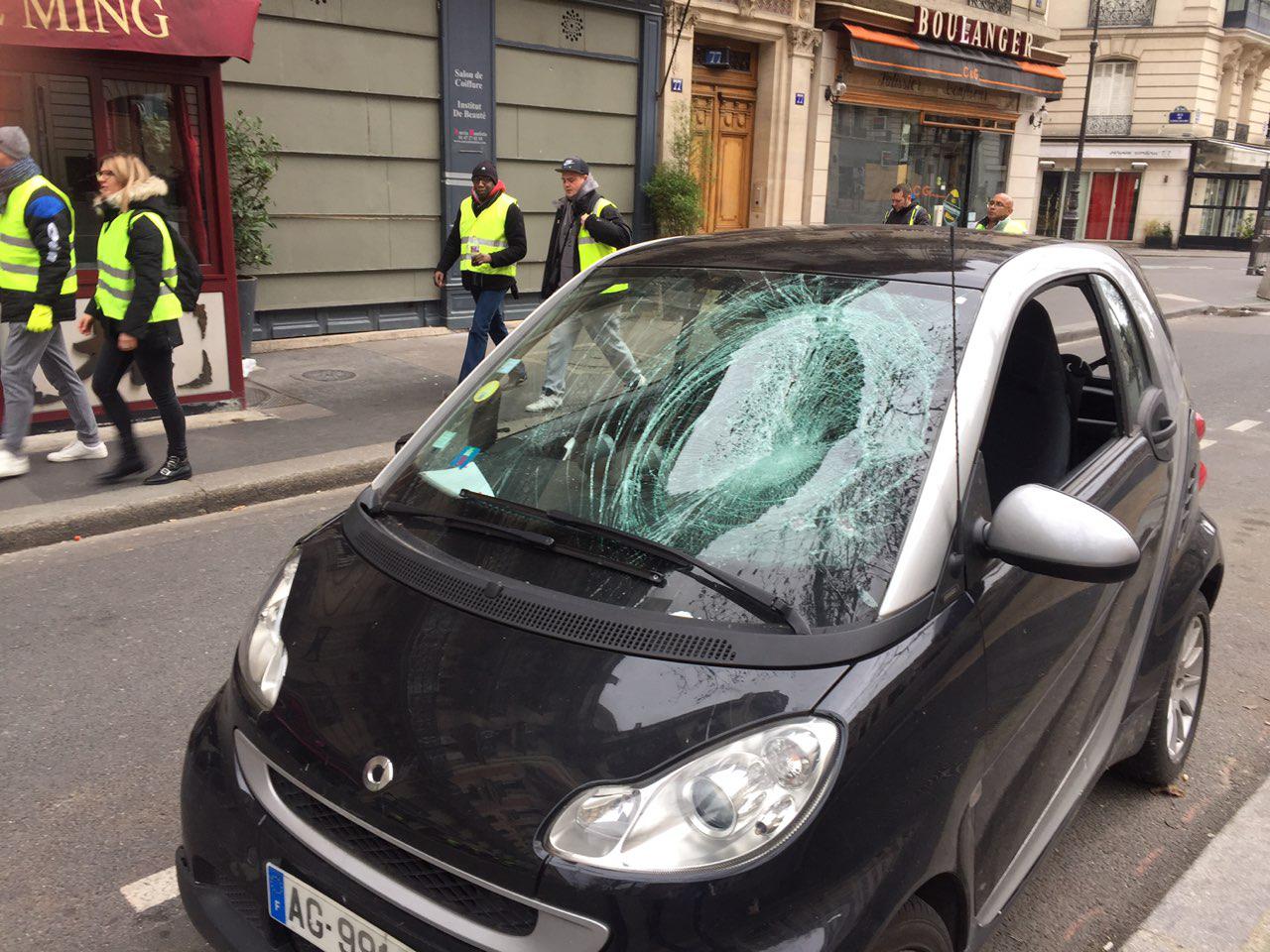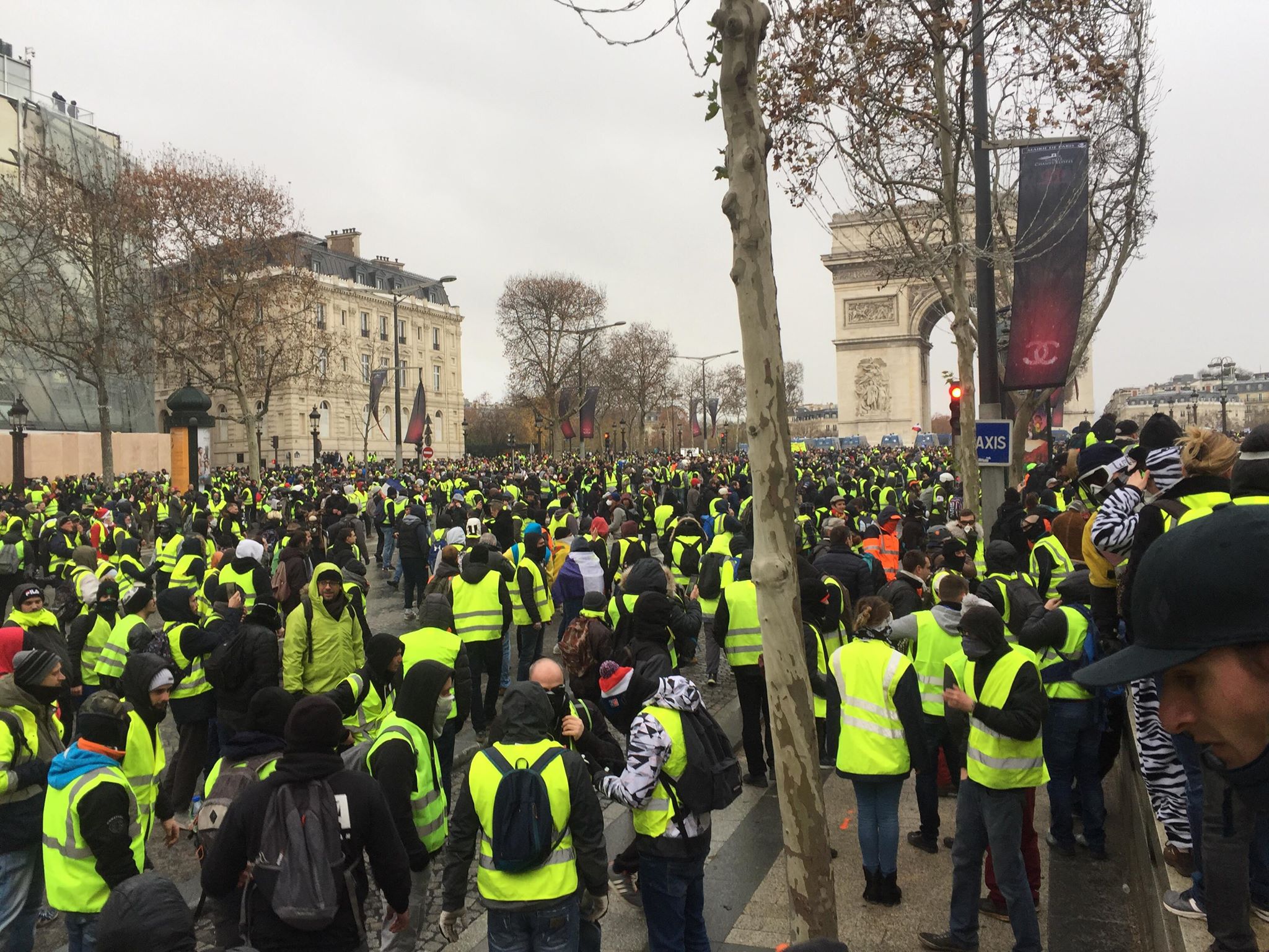Пик протестов пришелся на 1 декабря. Общее число протестующих по всей стране оценивалось полицией в 136 тысяч человек. Также не обошлось без погромов, поджогов машин, разрушений магазинов и банков. Была повалена ограда сада Тюильри, разграблены магазины в центре города, а символ Парижа Триумфальная арка разрисована граффити.