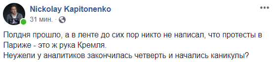 "Полдня прошло, а в ленте до сих пор никто не написал, что протесты в Париже - это ж рука Кремля. Неужели у аналитиков закончилась четверть и начались каникулы?", - иронизирует политолог Николай Капитоненко.