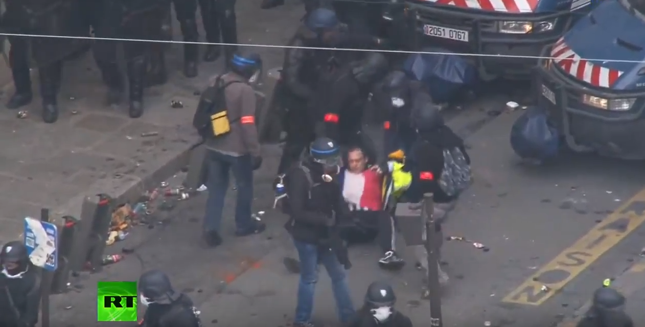 11:42 Стычки, о которых говорилось ниже, начались у Триумфальной арки. Протестующие начали бросать дымовые шашки, полиция ответила газом.