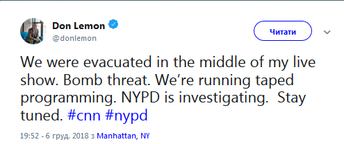 "Нас эвакуировали посреди моей программы. Угроза взрыва. Мы пустили запись. Будьте в курсе", - написал Дон Лемон в своем Twitter.