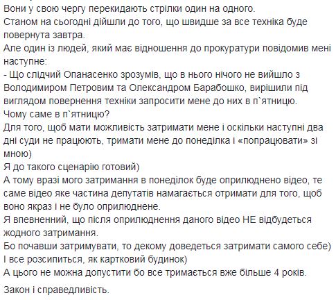 "Следователь Виталий Опанасенко понял, что у него ничего не получилось с Владимиром Петровым и Александром Барабошко, решил под видом возврата техники пригласить меня к ним в пятницу. Почему именно в пятницу? Для того, чтобы иметь возможность задержать меня и так следующие два дня суды не работают, держать меня до понедельника и "поработать" со мной", - написал журналист.