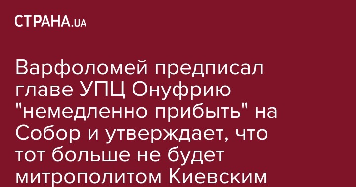 Варфоломей предписал главе УПЦ Онуфрию "немедленно прибыть" на Собор и утверждает, что тот больше не будет митрополитом Киевским