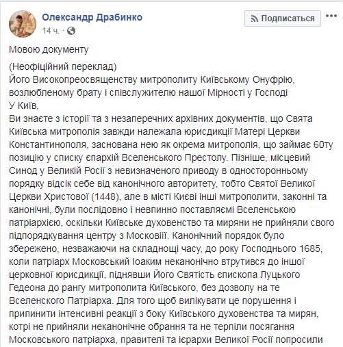 Вселенский патриарх Варфоломей направил письмо предстоятелю УПЦ МП Онуфрию с призывом "немедленно прибыть" на Объединительный собор и принять участие в нем. Письмо, датированное, что любопытно, еще 12 октября, обнародовал на своей странице в Facebook митрополит УПЦ МП Александр Драбинко (единственный безоговорочный сторонник автокефалии среди иерархов УПЦ).