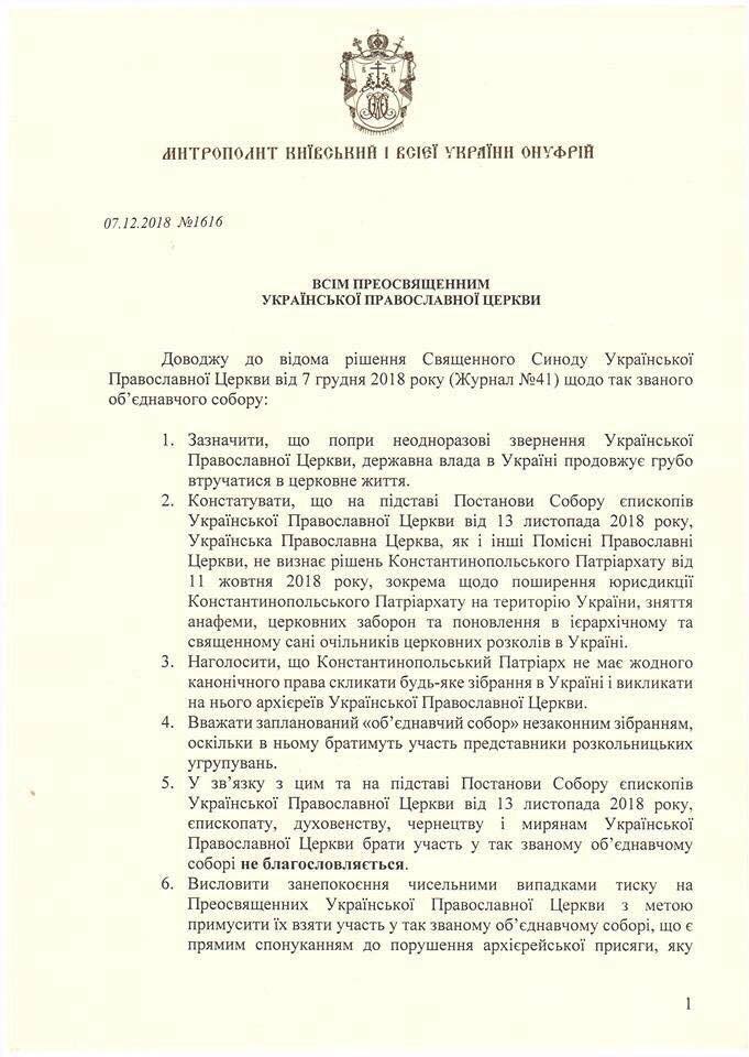 А предстоятель Украинской православной церкви (МП) митрополит Онуфрий отправил письмо с приглашением на "объединительный Собор" обратно главе Константинопольского патриархата Варфоломею. Он запечатал послание в конверт и оставил его без ответа.