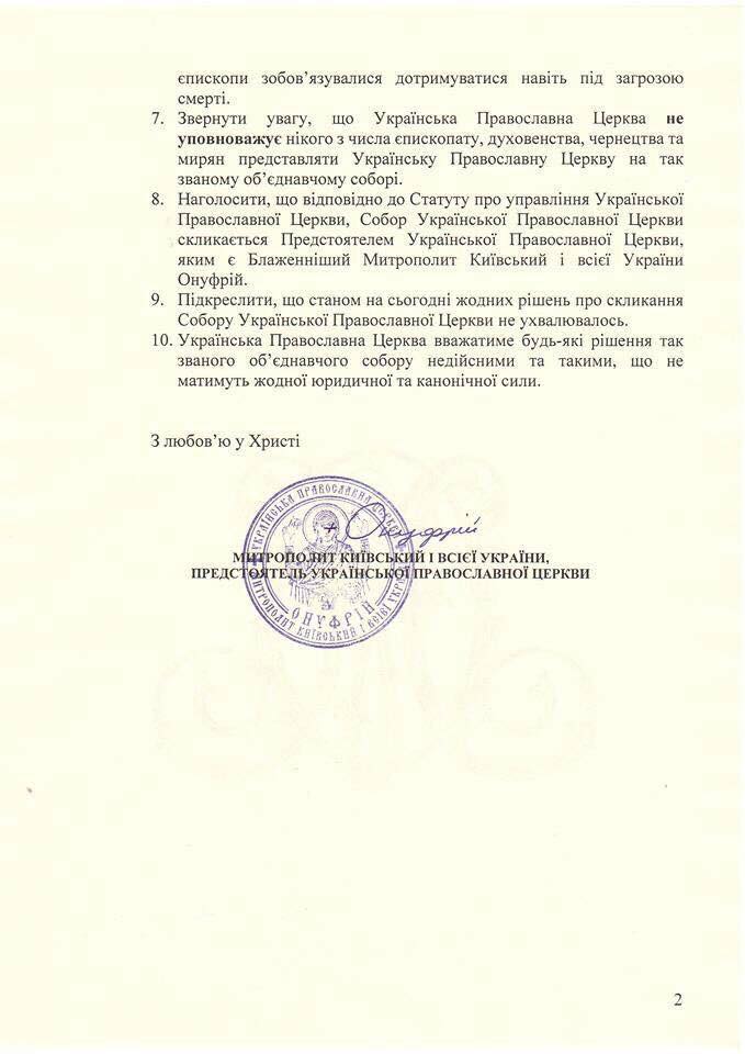 10. Украинская Православная Церковь будет считать любые решения так называемого объединительного собора недействительными и такими, которые не будут иметь юридической и канонической силы.