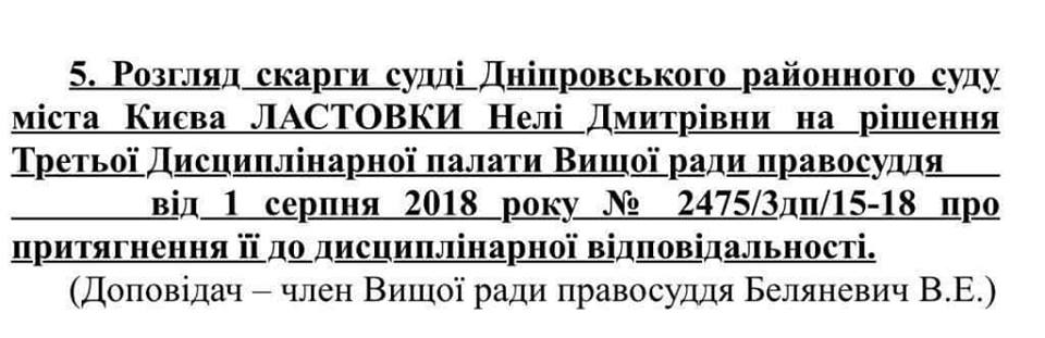 Напомним, что 1 августа, Высший совет правосудия вынес решение о применение к судье Днепровского суда города Киеве Нелле Ластовке дисциплинарного взыскания и увольнении.
