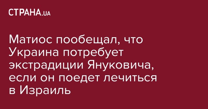 В случае, если экс-президент Украины Виктор Янукович выедет на лечение в Израиль, то Украина обратится к властям этой страны за его выдачей. Об этом сообщил заместитель генпрокурора–главный военный прокурор Украины Анатолий Матиос, пишет "Интерфакс".