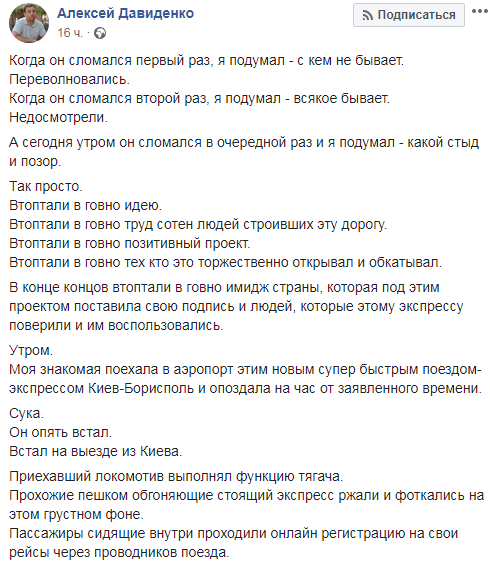 "Когда он сломался первый раз, я подумал - с кем не бывает. Переволновались. Когда он сломался второй раз, я подумал - всякое бывает. Недосмотрели. А когда утром он сломался в очередной раз и я подумал - какой стыд и позор", – пишет Давиденко.