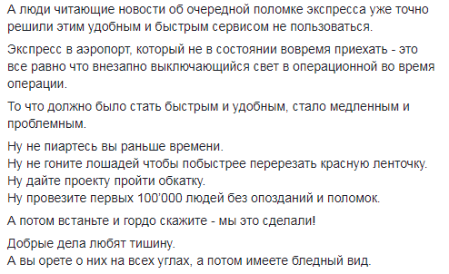 "Экспресс в аэропорт, который не в состоянии вовремя приехать - это все равно что внезапно выключающийся свет в операционной во время операции. То что должно было стать быстрым и удобным, стало медленным и проблемным. Ну не пиарьтесь вы раньше времени. Ну не гоните лошадей, чтобы побыстрее перерезать красную ленточку… Добрые дела любят тишину. А вы орете о них на всех углах, а потом имеете бледный вид", - подытожил экс-депутат.