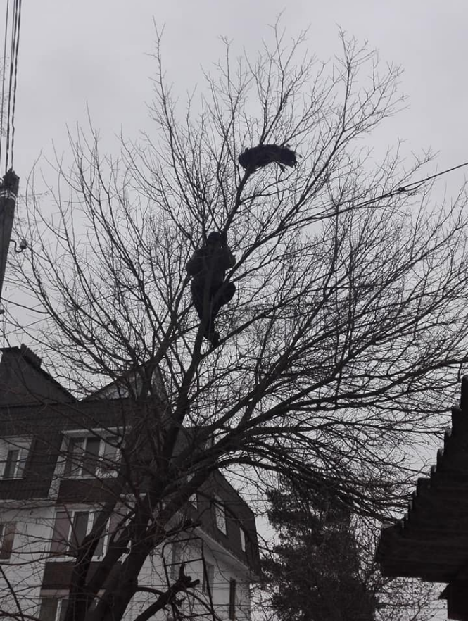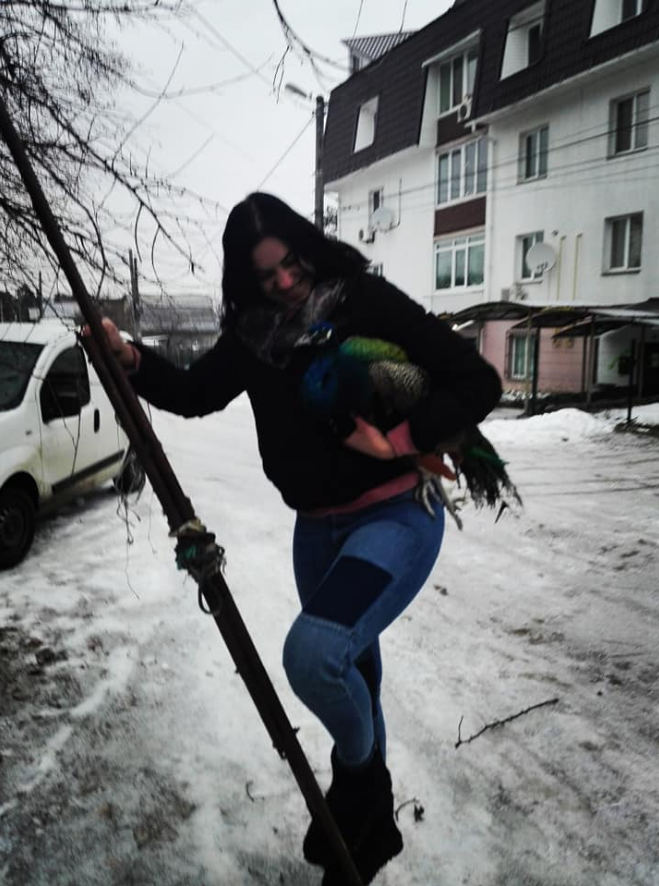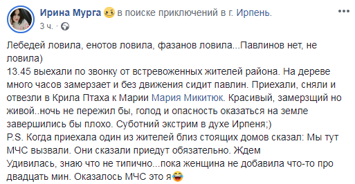 "Лебедей ловила, енотов ловила, фазанов ловила...Павлинов нет, не ловила). В 13.45 выехали по звонку от встревоженных жителей района. На дереве много часов замерзает и без движения сидит павлин. Приехали, сняли и отвезли в "Крила Птаха" к Марии Мария Микитюк. Красивый, замерзщий, но живой... Ночь не пережил бы, голод и опасность оказаться на земле завершились бы плохо. Суботний экстрим в духе Ирпеня", - написала Ирина Мурга.