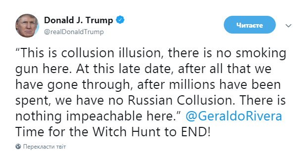 "Это иллюзия заговора, нет ни одного доказательства заговора... После всего, что мы пережили, после того, как потратили миллионы (на расследование - Прим.Ред.) - мы видим, что заговора с Россией нет. Нет ничего для импичмента. Пора прекратить охоту на ведьм", - говорится в Twitter-микроблоге Трампа в субботу, 8 декабря.