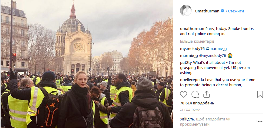 Ума Турман приехала в Париж, чтобы поддержать протесты, фото: instagram.com