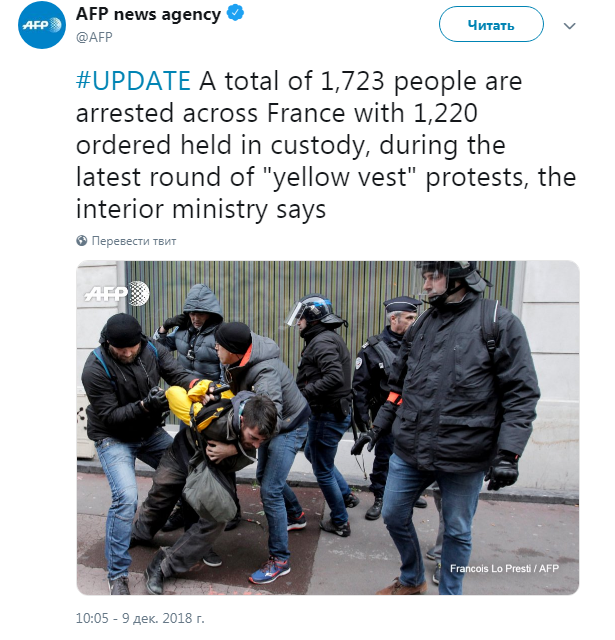 Во Франции продолжаются аресты после массовых протестов "желтых жилетов", которые проходили вчера, 8 декабря. Об этом сообщает AFP на своей странице в Twitter.