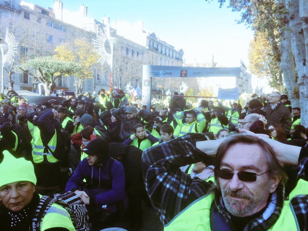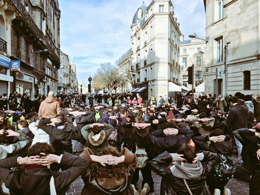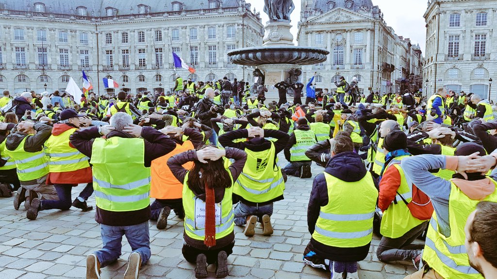 В знак протеста против жесткого задержания протестующих школьников 7 декабря, во время акций "желтых жилетов", во Франции митингующие массово становились на колени в ходе демонстраций, продолжающихся по всей стране 8 декабря.