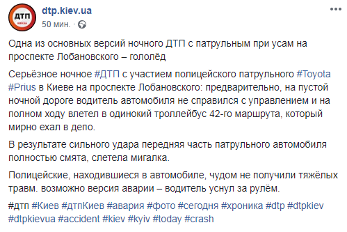 Ночью на проспекте Лобановского, предположительно из-за гололеда, полицейский Toyota Prius на полном ходу въехал в пустой троллейбус 42-го маршрута, который направлялся в депо. В результате аварии смяло переднюю часть служебной машины. Патрульные не получили серьезных травм.