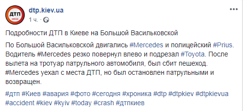 Уже утром на Большой Васильковской произошла третья авария с участием полицейского авто. Mercedes, который двигался по улице, свернул налево из правого ряда, в результате чего подрезал авто патрульной полиции. Водитель выкрутил руль и вылетел в ограждение кафе, сбив пешехода. У пострадавшего травма ноги. Mercedes уехал с места, но патрульные догнали его и вернули на место ДТП.