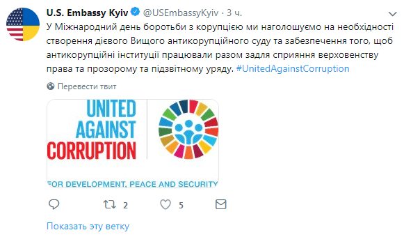 "В Международный день борьбы с коррупцией мы подчеркиваем необходимость создания работоспособного Высшего антикоррупционного суда и обеспечения того, чтобы антикоррупционные институции работали вместе для содействия верховенству права и прозрачному подотчетному правительству", - сказано в сообщении.