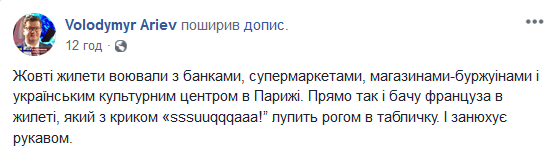 "Желтые жилеты воевали с банками, супермаркетами, магазинами-буржуинами и украинским культурным центром в Париже. Прямо так и вижу француза в жилете, который с криком "sssuuqqqaaa!" Лупит рогом по табличке. И занюхивает рукавом", - написал Владимир Арьев в своем Facebook.