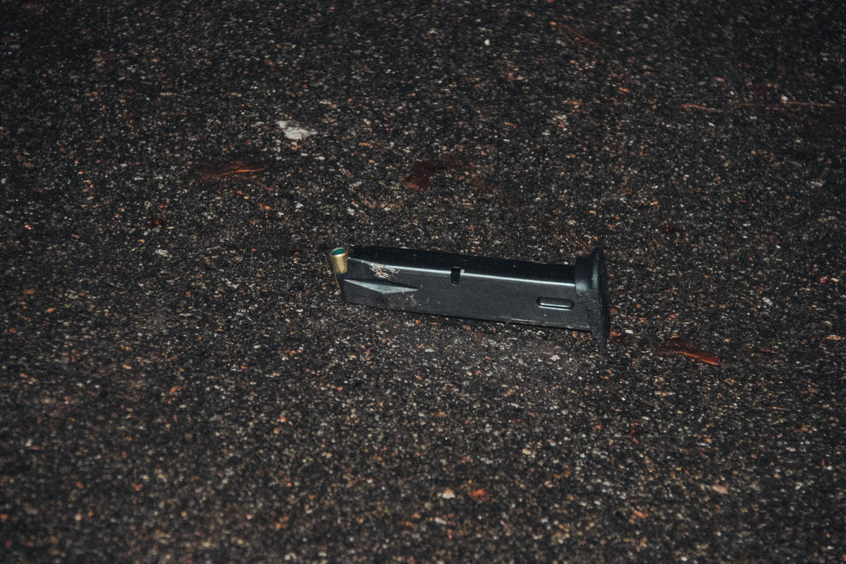 На месте ЧП на асфальте остались следы крови, разбросаны гильзы, а также оставлен магазин от пистолета.