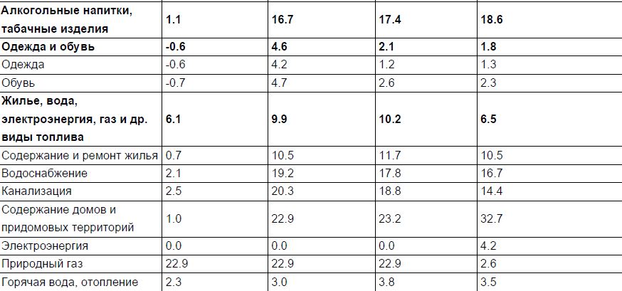 Рост цен (тарифов) на 6,1% на жилье, воду, электроэнергию, газ и другие виды топлива произошел главным образом за счет повышения тарифов на природный газ на 22,9%, а также тарифов на канализацию - на 2,5%, горячую воду и отопление - на 2,3%, водоснабжение - на 2,1%.