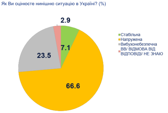 При этом 14,3% респондентов считают социально-экономическую ситуацию посредственной, только 0,9% хорошо оценивают положение в Украине, еще 2,8% затруднились с ответом или вообще отказались отвечать.