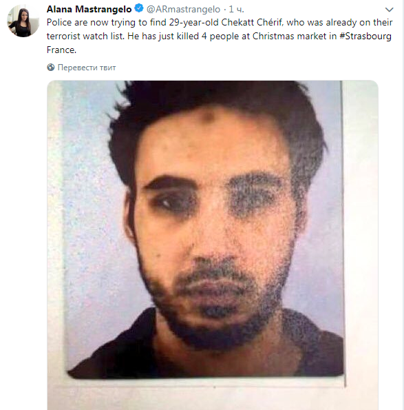Опубликовано фото мужчины, которого подозревают в том, что он устроил стрельбу в центре Страсбурга 11 декабря. Его обнародовали пользователи Twitter.