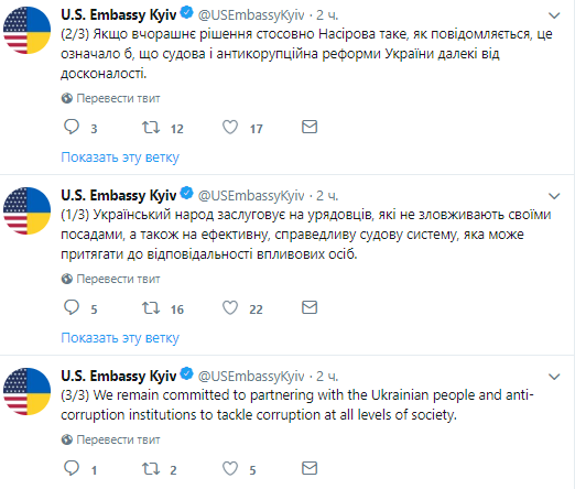 Посольство США подчеркивает, что украинский народ заслуживает правительственных чиновников, которые не злоупотребляют своими должностями, а также эффективную, справедливую судебную систему, которая может привлекать к ответственности влиятельных лиц.