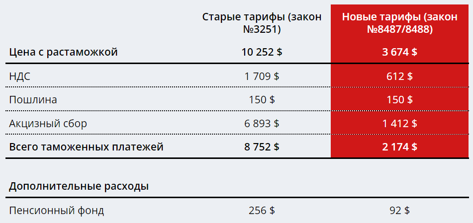 Стоимость растаможки гибридных авто также подешевела: для них действует фиксированная ставка акцизного налога 100 евро за единицу техники. Благодаря этому снижается и налог на добавленную стоимость, и сбор в Пенсионный фонд. Ведь они высчитываются с учетом цены транспортного средства, акцизного налога и таможенной пошлины.