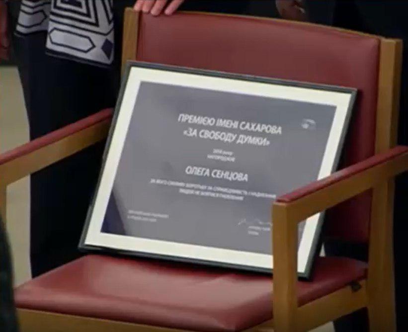 Во время вручения награды в зале Европарламента стоял пустой стул, который предназначался для Олега Сенцова. Ранее журналист "Радио Свобода" Рикард Йозвяк отмечал, что большим вопросом является то, сможет ли Сенцов лично присутствовать на церемонии награждения 12 декабря, - награду получит его родственник либо же там будет стоять "пустой стул".