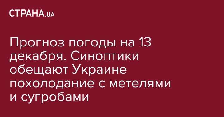 Также "Страна" писала, что 12 декабря в Черниговской, Киевской, Житомирской, Черкасской, Полтавской, Кировоградской, Николаевской областях выпадет сильный снег с налипанием мокрого снега, метели, порывы ветра 15-20 м/с. Прирост снежного покрова – 12-20 см, рассказали в Гидрометцентре.