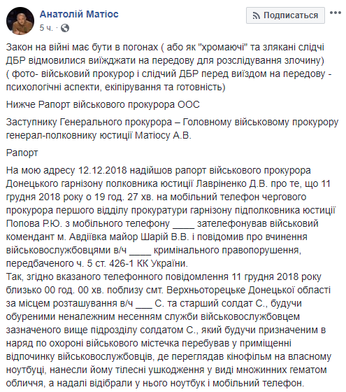 В одной из воинских частей Донецкой области военные избили сослуживца, отобрав у него ноутбук и мобильный телефон. Об этом сообщил главный военный прокурор Анатолий Матиос на своей странице в Facebook.