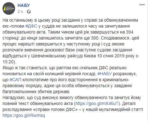 "Таким образом, этот год завершается на 394 странице (обвинительного акта - Прим.Ред.): до конца осталось зачитать еще 380. Надеемся, этот процесс наконец завершится в следующем году, и суд сможет начать изучение доказательной баз", - сказано в сообщении НАБУ.